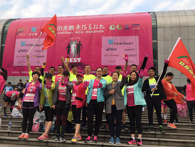 作为有活力有运动精神的企业一员,南国红豆控股有限公司唐勇、张赞莉、包海燕、孙娜等一行运动爱好者,自发地组织跑团,代表公司参加本次无锡马拉松赛事,成为2017年锡马赛道上一支独特又靓丽的风景线。