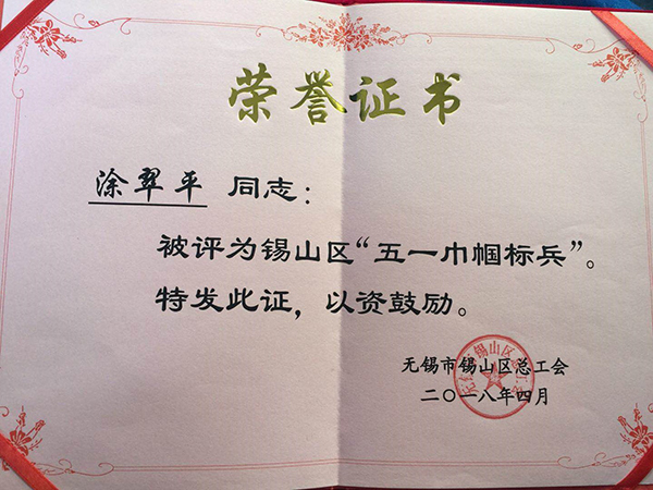 南国红豆——南国服饰外贸员工涂翠平同志被评为锡山区“五一巾帼标兵”。