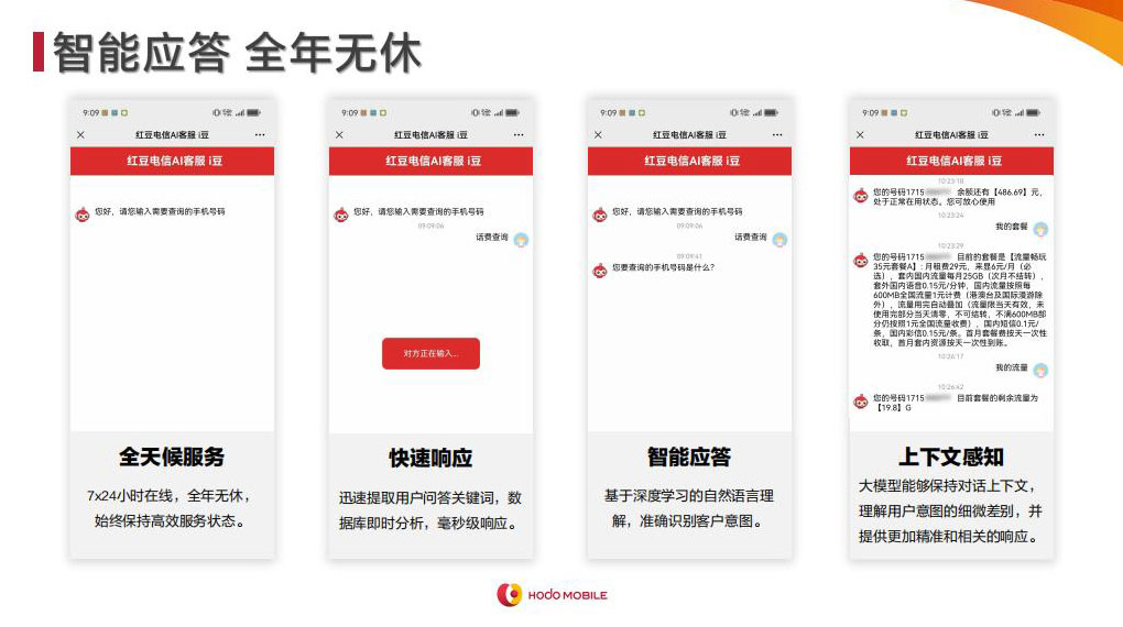 红豆电信 AI 智能客服自 2024 年上线以来,表现十分亮眼。年度服务访问数达 215799 人,问答次数高达 733501 次,服务人数增长了 4 倍,凭借高效、便捷的服务体验赢得了广大用户的认可。其核心优势主要体现在以下几个方面: