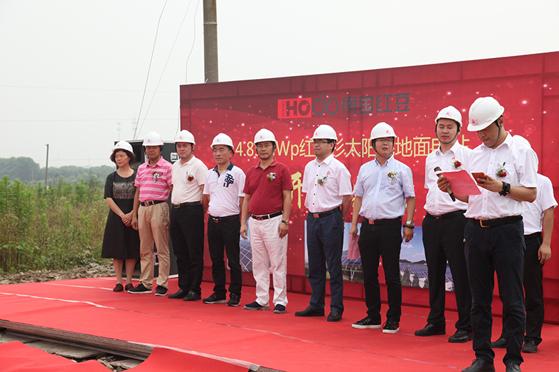 红豆杉太阳能地面电站项目经理在开工典礼仪式上郑重讲到:要秉承项目宗旨,强化工程管理意识;严格规范施工管理,项目质量;全力以赴,严格把控,责任到人,调动全体员工的积极性,确保项目的顺利完成。接着,信息产业电子第十一设计研究院科技工程股份有限公司季董事长介绍了研究院的具体业务范围,并对南国红豆控股有限公司投资建设的4.85MWp红豆杉太阳能地面电站项目给予极大的评价,指出此次项目具有很大的发展前景,他们也将在电站的建设过程当中文明施工、科学调配,使该项目早日投产。