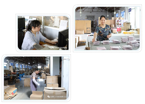 走进红豆缘仓库,映入眼帘的是打包完毕、排列整齐的包裹;以及“叮咚,叮咚”扫描产品的声音,还有一阵阵“嗞,嗞,嗞”成品打包的声音;还会看到一个个来回穿梭、疾步如飞的身影,手里拿着一摞厚厚的单子,怀里抱着摞的高高的货品,嘴巴里念叨着“组合A160,1包,组合B165,2包……”一张订单配完配下一张,再一个个地分配到快递包装盒里,每天重复着几百次,上千次流程,他们就这样日复一日,年复一年地工作着。