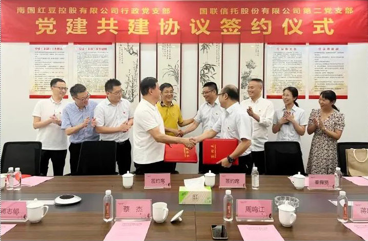 党的十九大指出,牢牢把握大团结大联合的主题,坚持一致性和多样性统一,找到撮大公约数,画出撮大同心圆。7月26日下午南国红豆控股有限公司行政支部委员会和国联信托股份有限公司第二支部委员会举行了“结对共建”签约仪式,出席签约仪式的有国联信托党总支书记、董事长周卫平、南国红豆党委书记、董事长周鸣江、国联信托第二支部书记、业务一部总经理秦舜贤、南国红豆党委副书记、行政党支部书记、红豆电力工程副董事长蔡杰、南国红豆党委委员、总经理蒋雄伟、国联信托业务一部副总经理潘双博、南国红豆党委委员、副总经理蒋志郁、国联信托一支部书记、综合管理部总经理季玲。