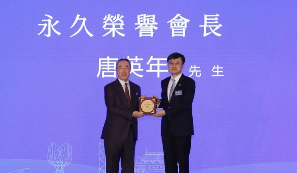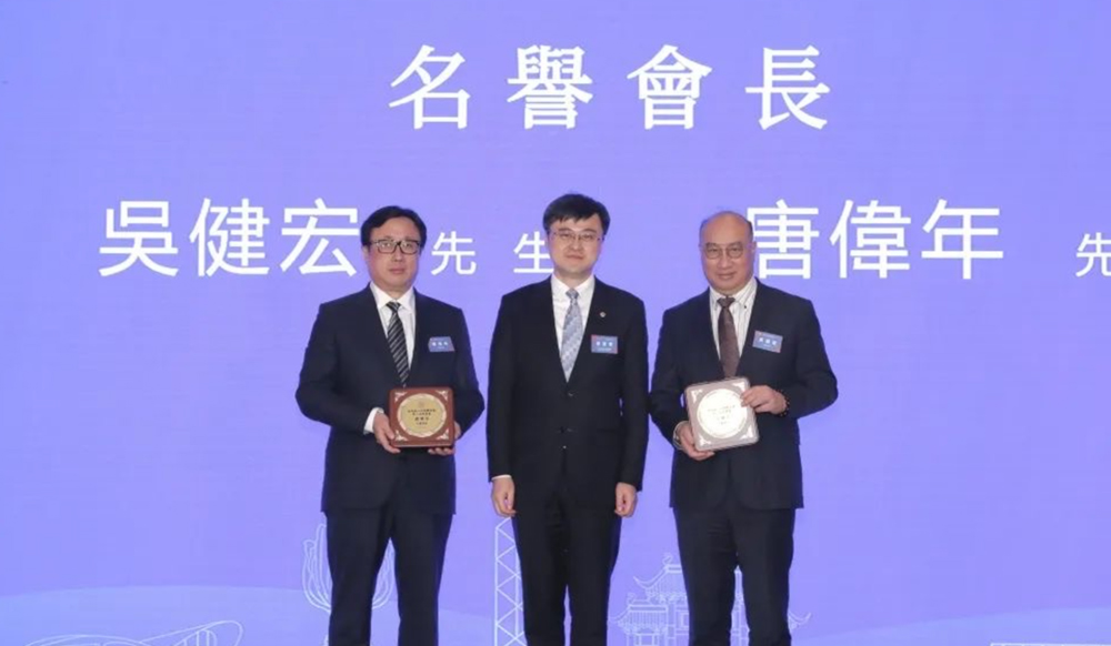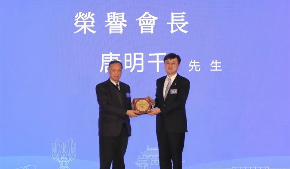 周常青为香港锡山同乡联谊会永久荣誉会长唐英年,荣誉会长唐明千,名誉会长吴健宏、唐伟年授牌。