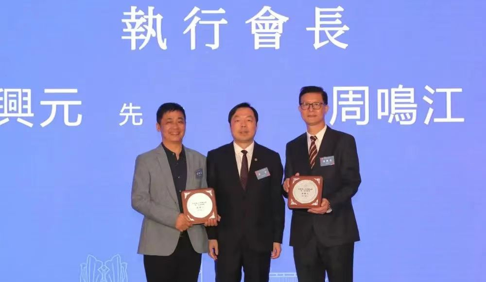 方力为香港锡山同乡联谊会会长唐庆年,执行会长冯兴元、周鸣江,常务副会长、副会长等授牌。