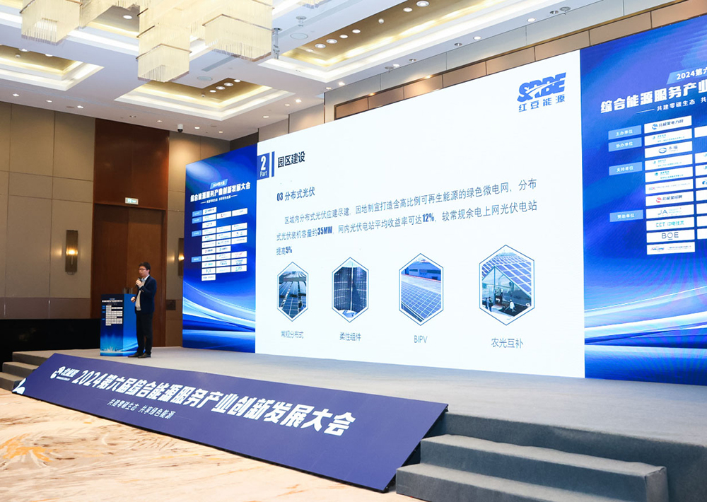 作为综合能源服务领域的先行者,红豆能源受邀出席本次大会,公司副总经理尤佳明发表《工业绿色微电网典型应用场景案例分享》主题演讲。他以红豆工业城绿色微电网项目为例,介绍了园区开展综合能源服务的具体实践:一方面以光储投资,多能互补的方式,部署包括供热、供冷、供电、供气等园区综合能源服务;另一方面围绕电力服务,通过微网供配电,延伸到用户侧的规划设计、节能诊断、运维改造等服务,实现园区多能源基础设施建设和管理。并逐渐通过智能化手段探索园区智慧能源管理路径,最终实现能源系统的互通互联,互补互济,达成能效提升、能耗降低的目标。