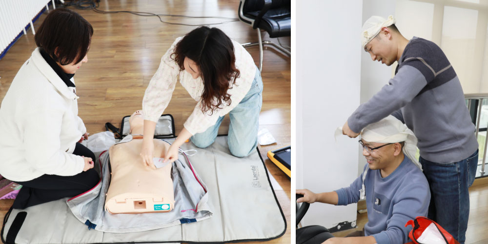 最后是持续有效的方法。老师们以通俗易懂的方式传授理论知识,利用现场演练等环节带领学员熟悉操作步骤及要领,不仅让我扩充了知识的储备,还学会了如何好好的利用黄金救援4分钟。心肺复苏是最关键的一个生命重启发力点,按压手势的是否正确、力度的深浅,有节奏且持续的救援都是决定伤者能否恢复意识的重要因素。随着课程推广,我还学习掌握了遇到成人、儿童气道异物梗阻、烧烫伤、肢体离断伤口的处理方法,加固练习了比较常用的环形包扎法、螺旋包扎法、“8”字等止血包扎法。